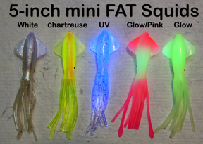 When “prospecting” an area or color choice, I like to try the UV, White or Chartreuse mini FAT Squids first. Early in the morning or when fishing deep the Glow works extremely well. For mature fish the Glow/Pink gets the nod.