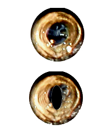 The image on the left shows a salmon eye that is very round. The lower image was adjusted by me to show an elongation of the pupil. As you can see, light passing through the round pupil vs. the elongated pupil will be different and distort color interpretation by the cones and rods in the fish’s eye.