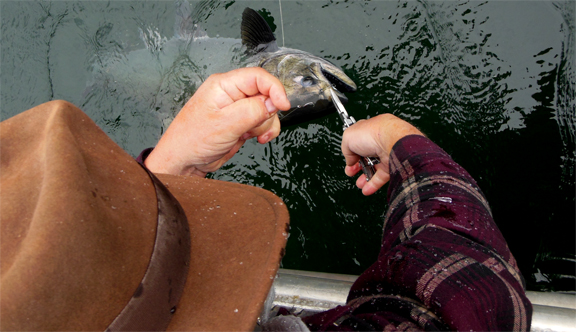 Captain Bob set the hook with his hand, then passed the rod to Captain Malcolm to give him a chance to play the Chinook on light line. The fish made four strong runs before calming down enough to release the hooks and let it go.