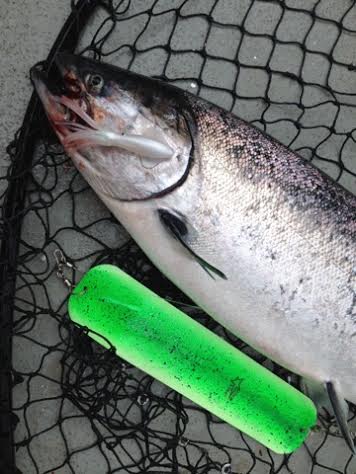 In addition to mini FAT Squids, hootchies combined with a flashy twinkle skirt fly also worked extremely well when targeting Chinook salmon. A small strip of salted herring pinned to the top hook adds the perfect amount of scent to the combination.