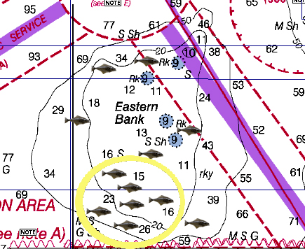 Here’s where I target salmon on Eastern Bank on high and low tides. Best depths range from 90 to 130 feet. During an outgoing tide the bait will move into deeper water, so be aware of this and move west and be ready to drop your downrigger balls deeper if needed.