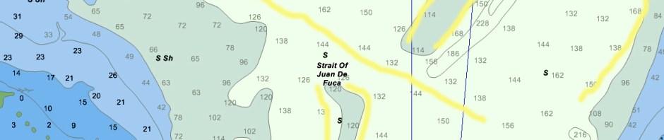 Either tide works here and enables anglers to explore and discover another great area close to Sequim. Like every other area the key is finding bait and working that bait. The “Dog Leg” shown above and outlined in yellow is an example of where to begin looking for bait before dropping your gear. If you don’t find bait move on and continue searching the area until you find some bait. Once found drop your gear and begin trolling. Mooching and jigging works well here too, especially when you find the bait.