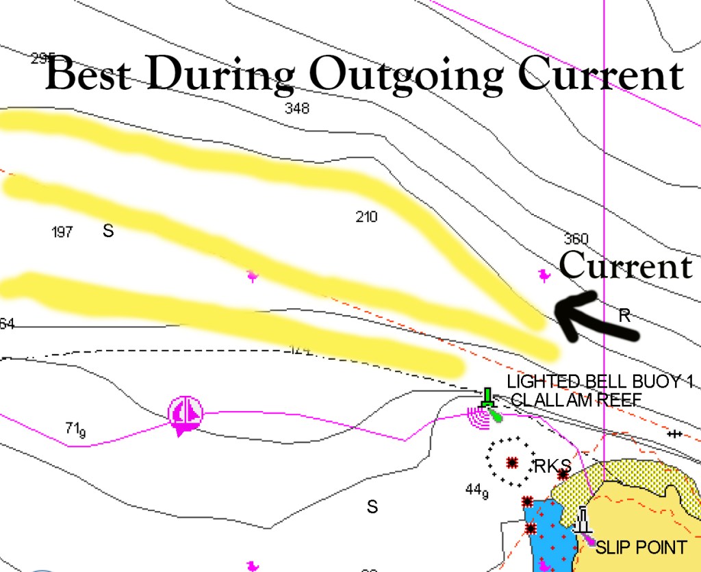 During an outgoing current Slip Point offers a multi-mile troll from east of the point toward the west. As the current sweeps past Slip Point massive schools of baitfish can be found throughout the water column. During heavy currents you will find blackmouth close to the bottom which could be as deep as 250 feet. Last season I fished Slip Point several times and had the best action on the 220-foot contour line. This depth requires heavy 15 pound balls and braid on your downrigger. These two key factors will give you better depth control and equate to higher catch rates.